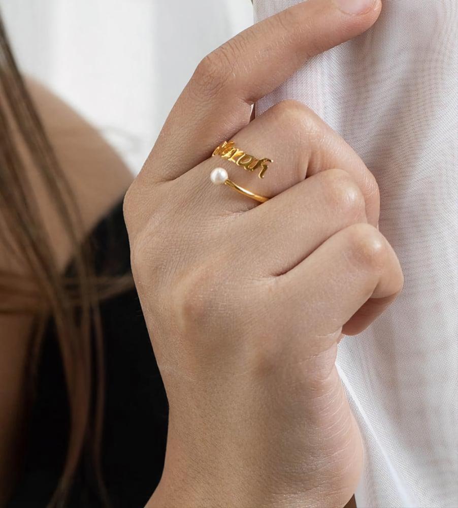 خاتم فاخر مطلي بالذهب، يتميز بتصميم أنيق يحمل اسمًا مميزًا بخط إنجليزي او عربي راقٍ مع لمسة عصرية. مزود بتفاصيل دقيقة وا لؤلؤه صغير ناعمه ترمز للحب وا الاناقه ، ليمنحك إطلالة راقية تناسب الهدايا والمناسبات الخاصة. ✨💍