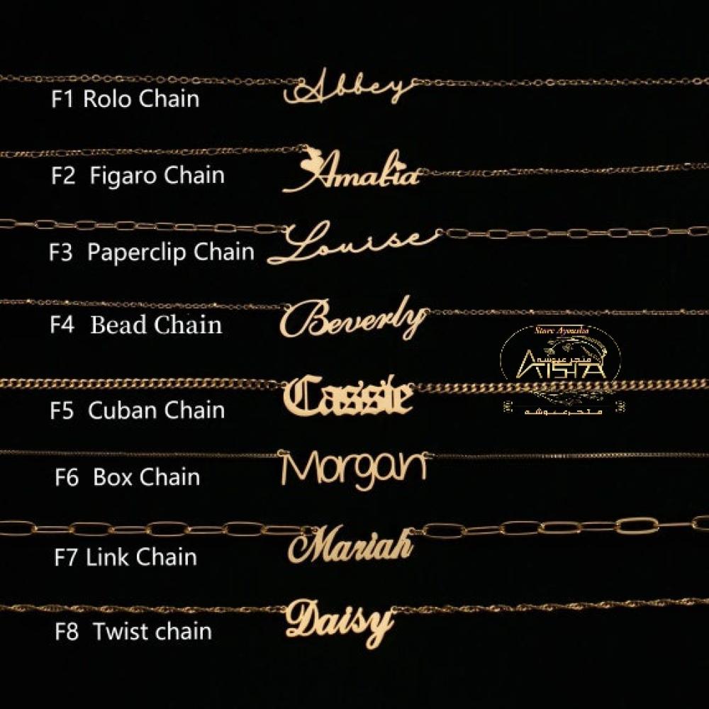 سلسال بالاسم مطليه بالذهب عيار 21 قيراط. السلسال بالاسم مصمم يزداد جمالاً بين عنقك و يضيف لمسه راقيه تعكس أناقتك